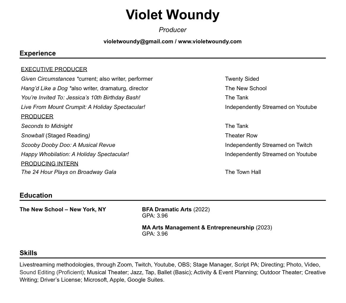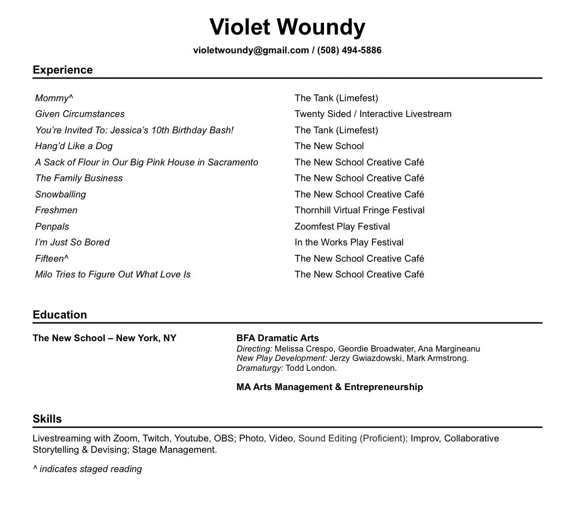 I'm Violet Woundy (she/they), a director and stage manager based in New York City.I began my conservatory theatrical training at Walnut Hill School for the Arts (Natick, MA). It has continued at The New School (NYC), where I graduated with a BFA Dramatic Arts and an MA Arts Management and Entrepreneurship.I’m passionate about developing new works in highly collaborative environments with writers, composers, actor, designers, stage managers and other multi-hyphenate theatre artists. I’m a detail oriented, creative problem solver, who relishes in the artistic impetus generated from challenges. Creating plenty of room for empathy, psychological safety, many perspectives and marginalized voices is the core of my philosophy.My work focuses on the normalization of all aspects of womanhood, queerness, trans, and chronically ill/disabled experience — where stories are not solely about the struggles of someone’s identity, but the fullness of their life beyond. I’m most excited by heightened language, fantasy and science fiction, and work that breaks gender binary roles. I bring a warm heart, lots of questions, and a sense of wonder and humor to everything I create.I strive to create immersive and accessible theatrical/new media experiences by casting from a race/gender/sexuality conscious, purposeful, equity-oriented lens; and keep my spaces physically and monetarily accessible through hybrid in-person and online work.Other passions of mine include tabletop and video games, cooking, and spending time with my kittens.